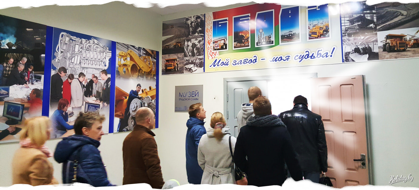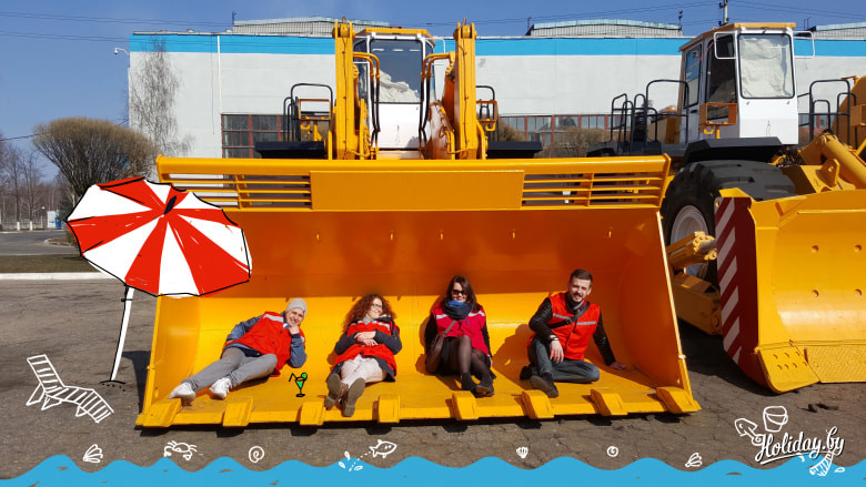 Счастливые, довольные, откатавшиеся на БЕЛАЗе гости и команда Holiday.by прошли в сборочный цех завода.