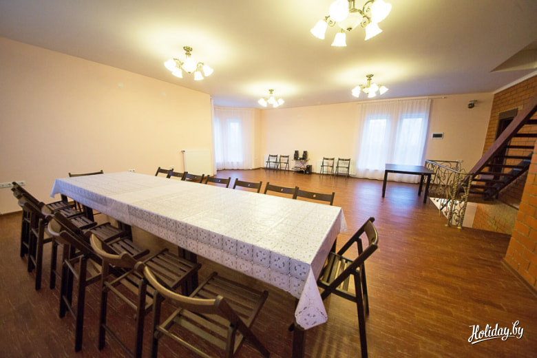 А еще в коттедже есть большой банкетный зал на 50 мест, где можно провести красивую свадьбу и веселый корпоратив.