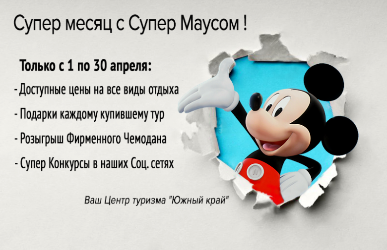 Свое пятилетие Южный край проведет под знаком Супер Мауса. Жизнерадостный персонаж из детства спасет вас от скуки и станет началом достойного путешествия. Приглашаем всех присоединиться.