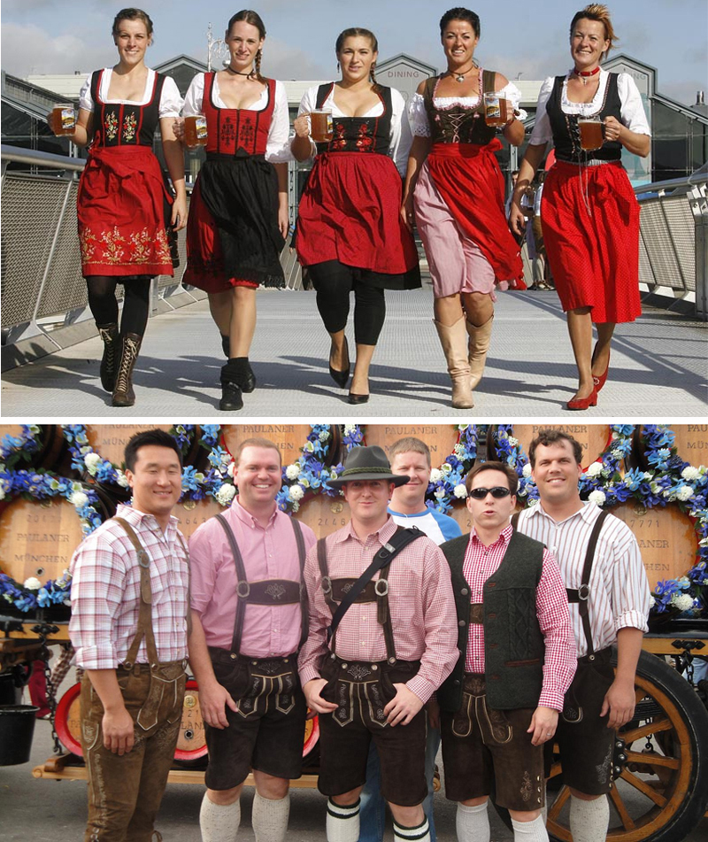 Если вы хотите придерживаться баварских традиций, то можете это сделать в некоторых причудливостях одежды. Женщины на Октоберфест могут одеть национальное платье «дирндлкляйд», которое продается не только в магазинах, но и в различных секонд-хэндах и базарах. Стоимость такого платья б/у составляет от 10 до 40 Евро (в зависимости от изношенности). Кроме платья, обязательным атрибутом является передник с повязанным бантом. Причем бант играет самую важную роль: если он справа – женщина замужняя, слева – в поисках кавалера. Мужчины могут надеть кожаные брюки (шорты), которые скрипят при движении (именно этот факт не позволяет купить штаны б/у). Обязательно должны присутствовать подтяжки, а на шее – широкая цепь с фигурными изображениями животных (охотничьи трофеи). В качестве головного убора следует одеть фетровую шляпу с пером.