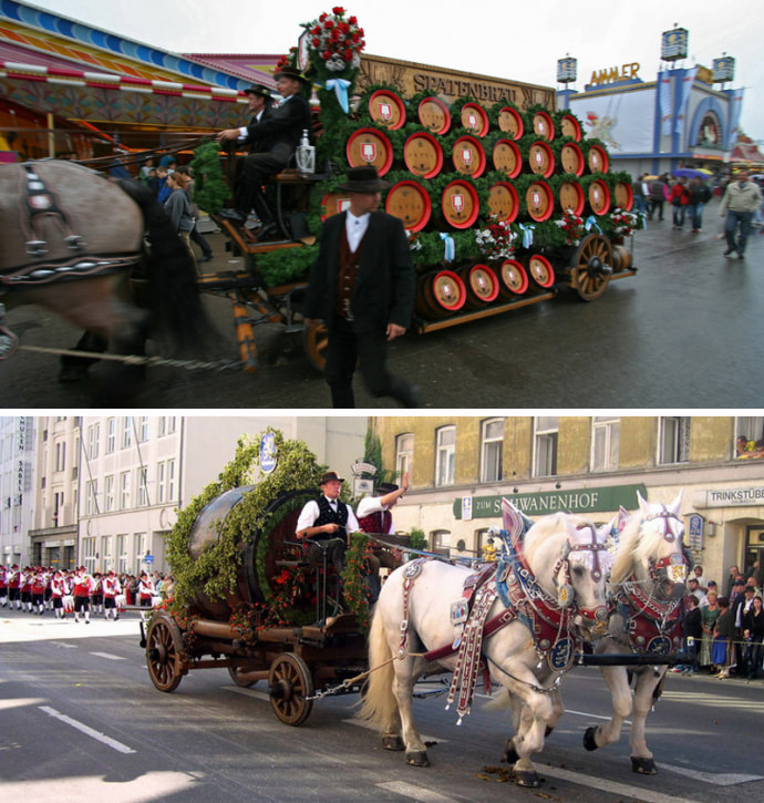 Начинается Октоберфест шествием хозяев пивных палаток, которые на лошадиных повозках везут бочки с пивом к своим палаткам.