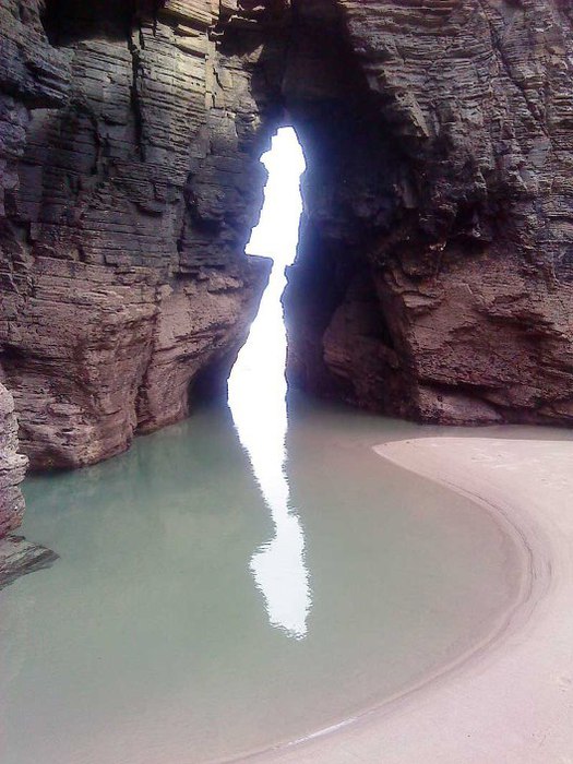 В 10 километрах от испанского города Рибадео в Галисии находится уникальное местечко Praia de Augas Santas (Пляж Святой воды), которое среди туристов получило название Playa de Las Catedrales (Пляж Кафедральных Соборов).Это место интересно своими природными арками готической формы высотой более 30 метров, которые становятся видны во всей красе только в период отлива.