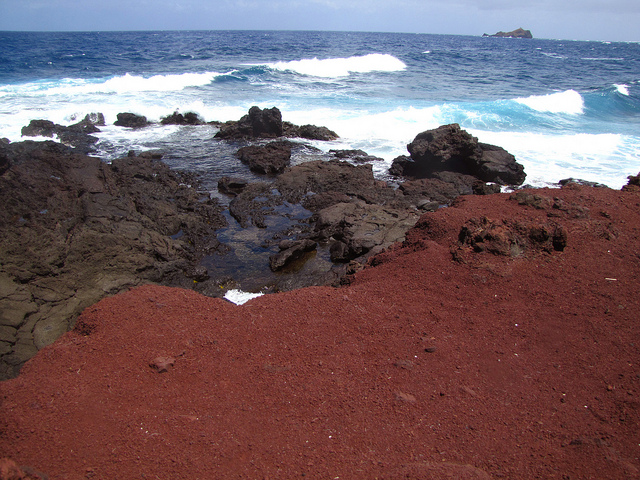 Красный пляж затерялся в бухте Хана на восточной части гавайского острова Мауи. Пляж Каихалулу (на гавайском “ревущее море”) один из немногих кроваво-красных в мире. Такой необычный цвет получился из-за расположенного рядом потухшего вулкана, крошащиеся склоны которого богаты железом.