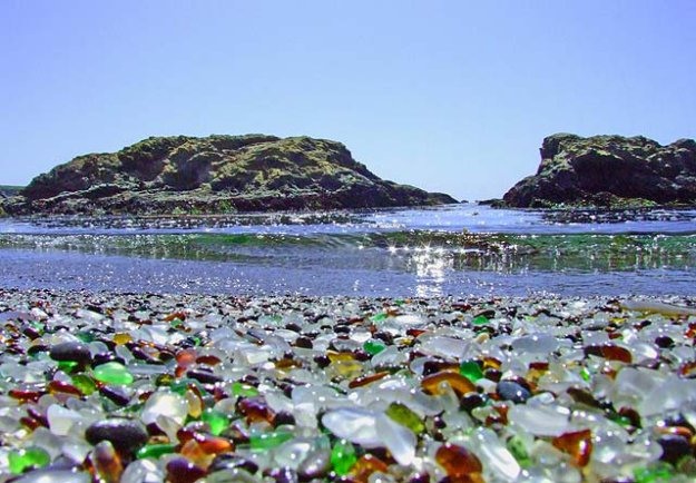 Есть одно интересное место - Стеклянный пляж (Форт-Брэгг, Калифорния, США). Удивительно это место своим необычным пляжем. В первой половине XX века на территории, где находится этот пляж, была свалка. В 60-е годы свалку закрыли, и с тех пор мусор был предоставлен самому себе. Горы битого стекла, пластмассы и прочего мусора так и оставались на берегу под теплыми калифорнийскими лучами, омываемые прибоями и обдуваемые морскими бризами. В итоге к 80-м годам обнаружили, что от свалки и следа не осталось, а все стекло, какое только было на пляже, под действием морской воды превратилось в удивительной красоты разноцветные полупрозрачные камни.И с тех пор потянулись на этот пляж туристы, место стало популярным. Нашлись даже умельцы, которые из этих гладких стекляшек делают всевозможные сувениры, которые отлично скупаются туристами, приезжающими посмотреть на это чудо вмешательства человека в дела природы.