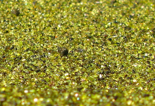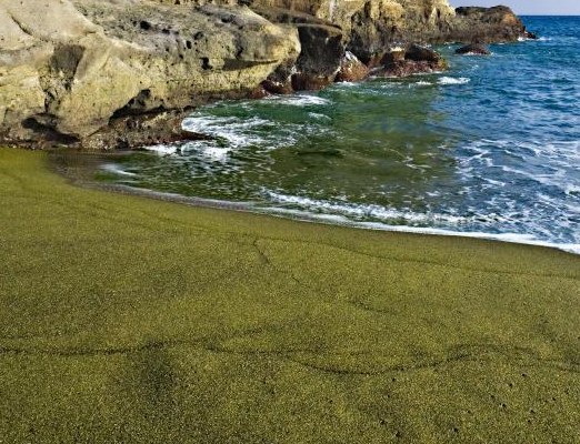 Пляж Папаколеа еще называют пляжем зеленого песка. Он находится в Саус-Пойнт на острове Гавайи. Окружающий пепловый конус, состоящий из кристаллов хризолита, придает пляжу зеленый оттенок. Издалека пляж кажется совершенно зеленым, но если взять горсть песка и рассмотреть его поближе, то можно увидеть больше кристаллов золотистых оттенков.