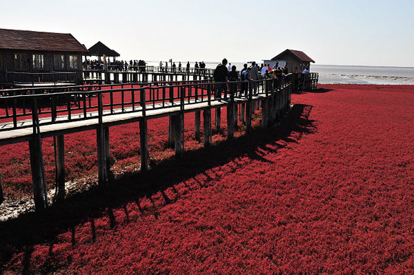 Провинция Liaoning в Китае каждый год привлекает тысячи туристов, которые спешат увидеть необычное явление - красный пляж и море. Красным его делают особый вид живущих здесь водорослей, которые отмирая становятся багряно-красными. Это можно увидеть только осенью и на определенном участке, где специально для туристов сделали смотровые площадки и подходы. Дело в том, что зона произрастания водорослей находится в заповедной зоне, поэтому только небольшая часть пляжа открыта для туристов.