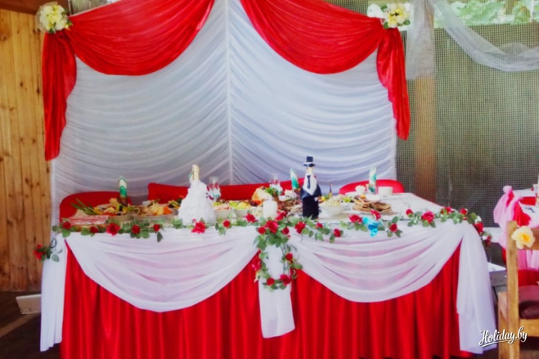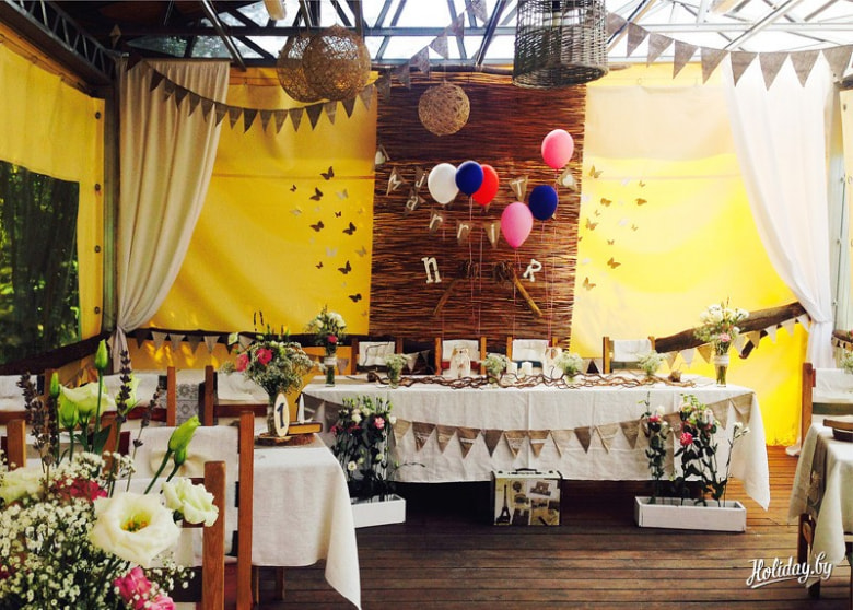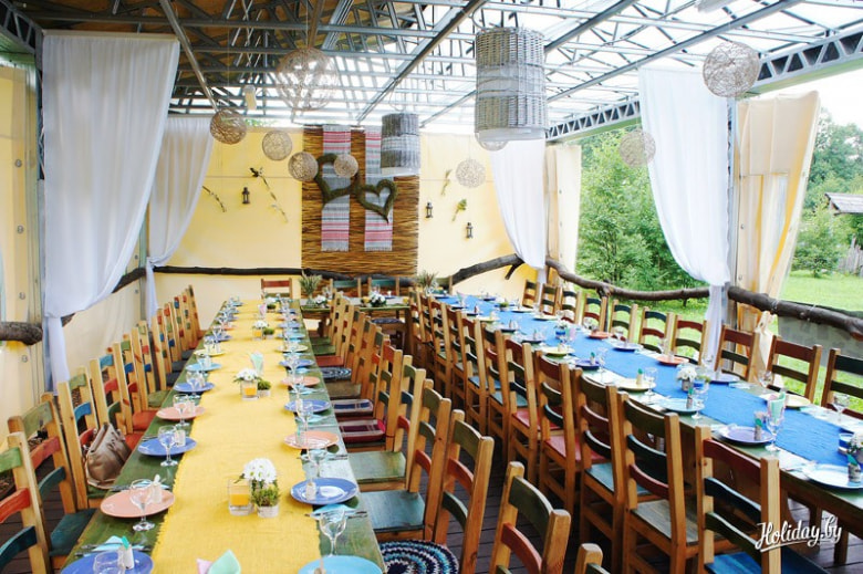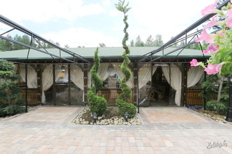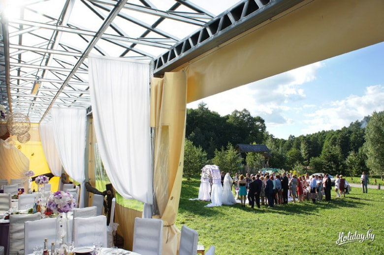 Местечко вблизи Минска предлагает проведение свадебной церемонии и банкет на крытой благоустроенной летней площадке, которая при дожде или ветре всего за 10 минут закрывается навесом.