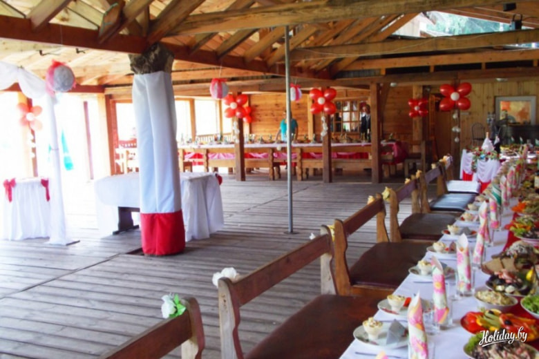 Деревянный особняк с каминным и бильярдным залами, баня, беседка, крытая танцевальная площадка – все это и многое другое предоставляется в полное ваше распоряжение, так что каждый гость точно найдет себе занятие. Кроме этого, хозяева заведения предлагают провести необычный второй день торжества: вместо готовки шашлыков, отправиться на экскурсию по Налибокской пуще (предлагается микроавтобус па 8-10 человек).