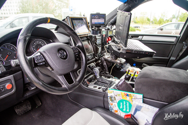Видеть мир из окна персонального автомобиля – это про таких ребят. Вчера на стоянке «Атлант-М Сухарево» я заметил очень необычный автомобиль. Брендированный а-ля спорт Volkswagen Touareg со спутниковой антенной на крыше. Немецкий автомобильный номер весь избит осколками и загнут по ветру. В кабине находился пилот, внимательно рассматривающий карту. Пока я парковал машину, необычного гостя и след простыл…