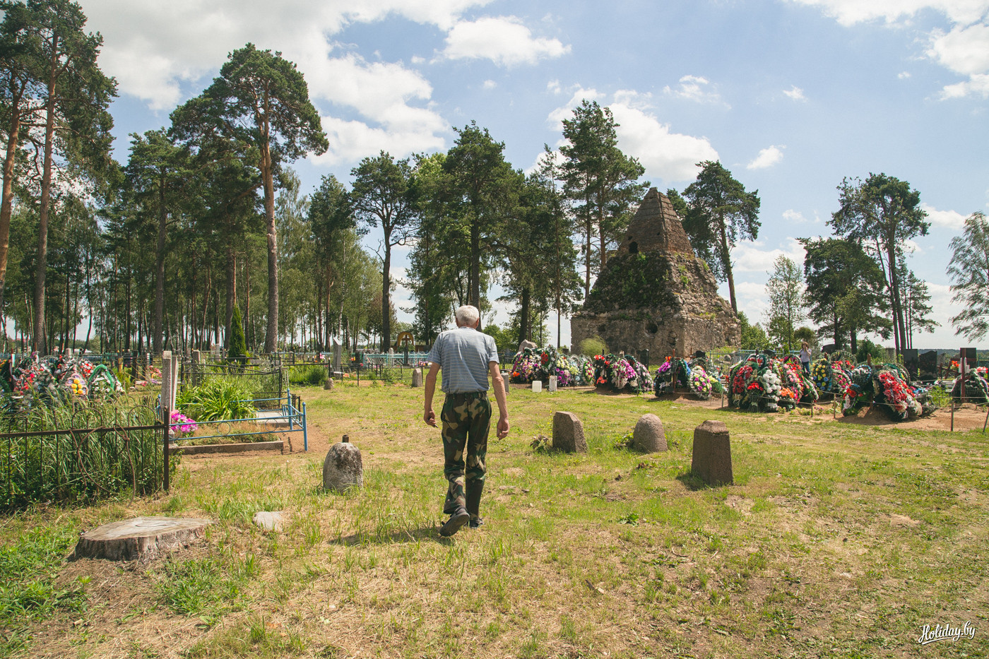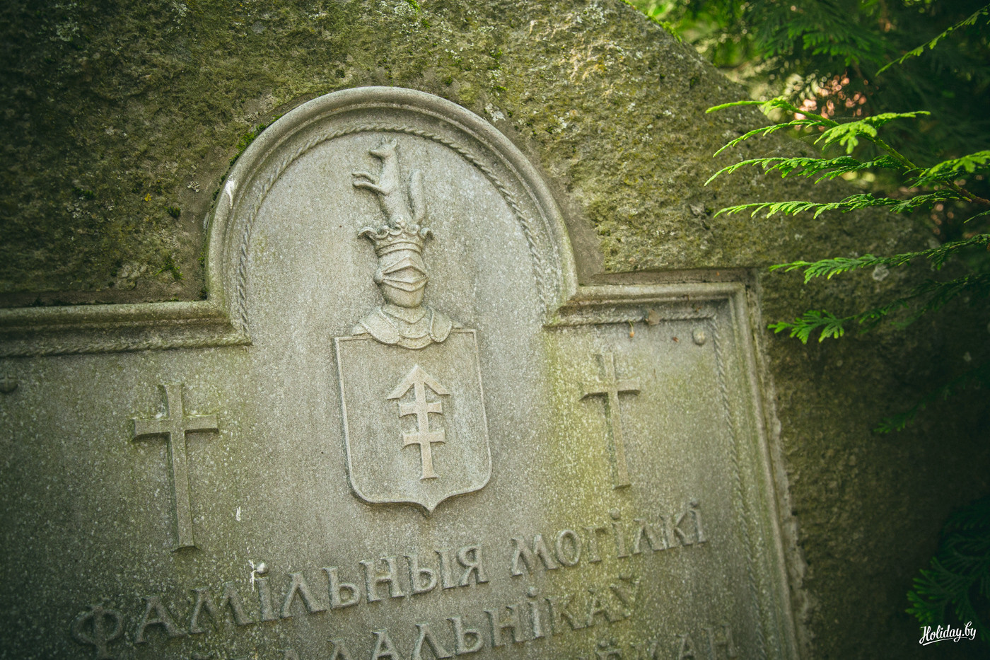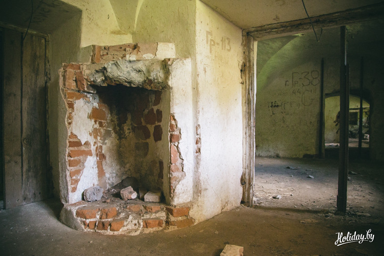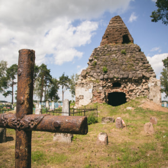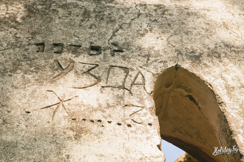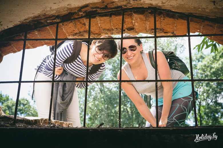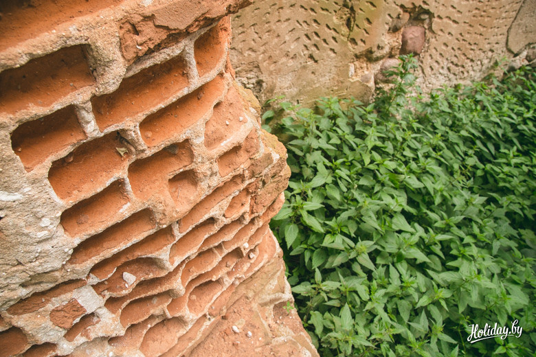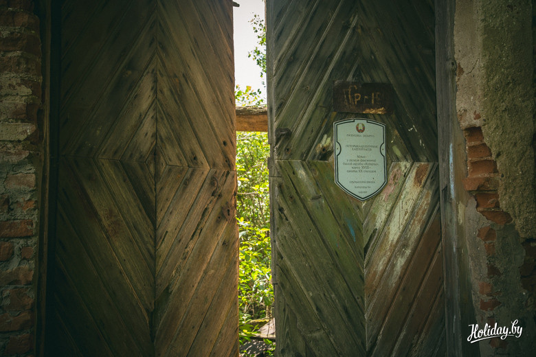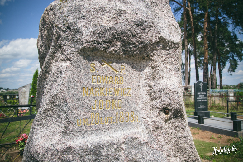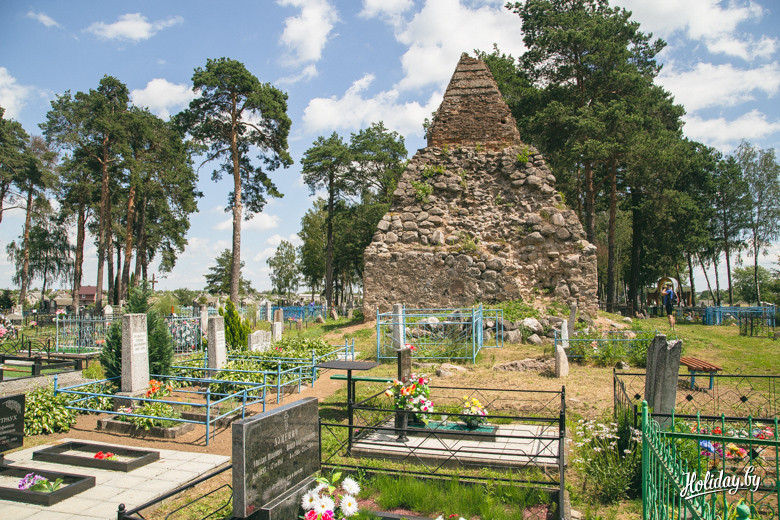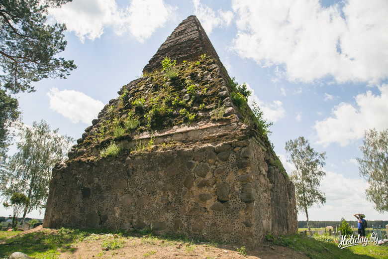 Надо понимать, что гробница давно разграблена и разрушается. Внутри в помещениях для гробов лежит кладбищенский мусор, а сквозь кирпич и штукатурку проросли деревья. По всем канонам в пирамиде есть «секретная комната» на втором ярусе, куда забраться можно только по стене строения. Будить духов Завишей мы не стали – поэтому осмотрели памятник только с земли. К слову, наряду с современными захоронениями, рядом с пирамидой находится могила представителя ещё одного известного рода – Наркевичей-Йодко.