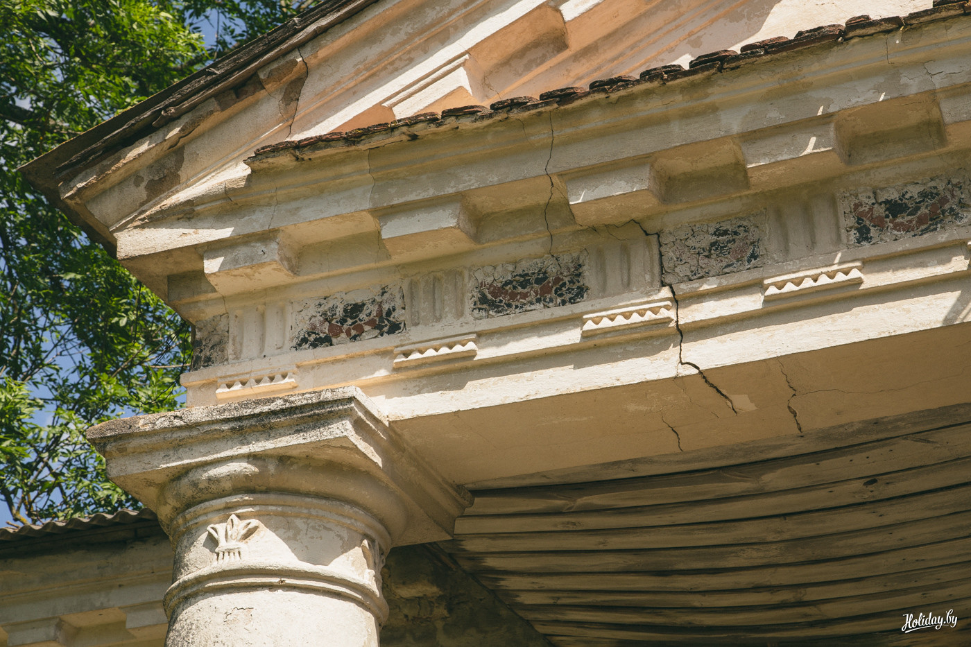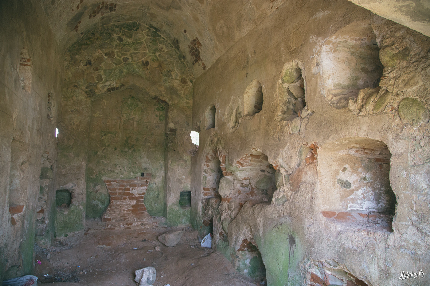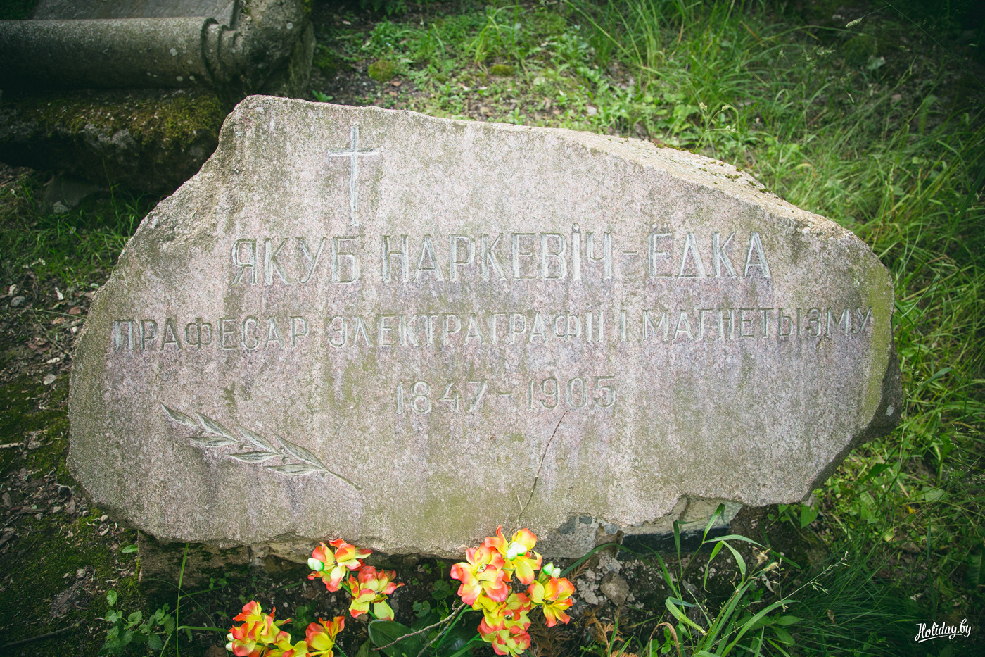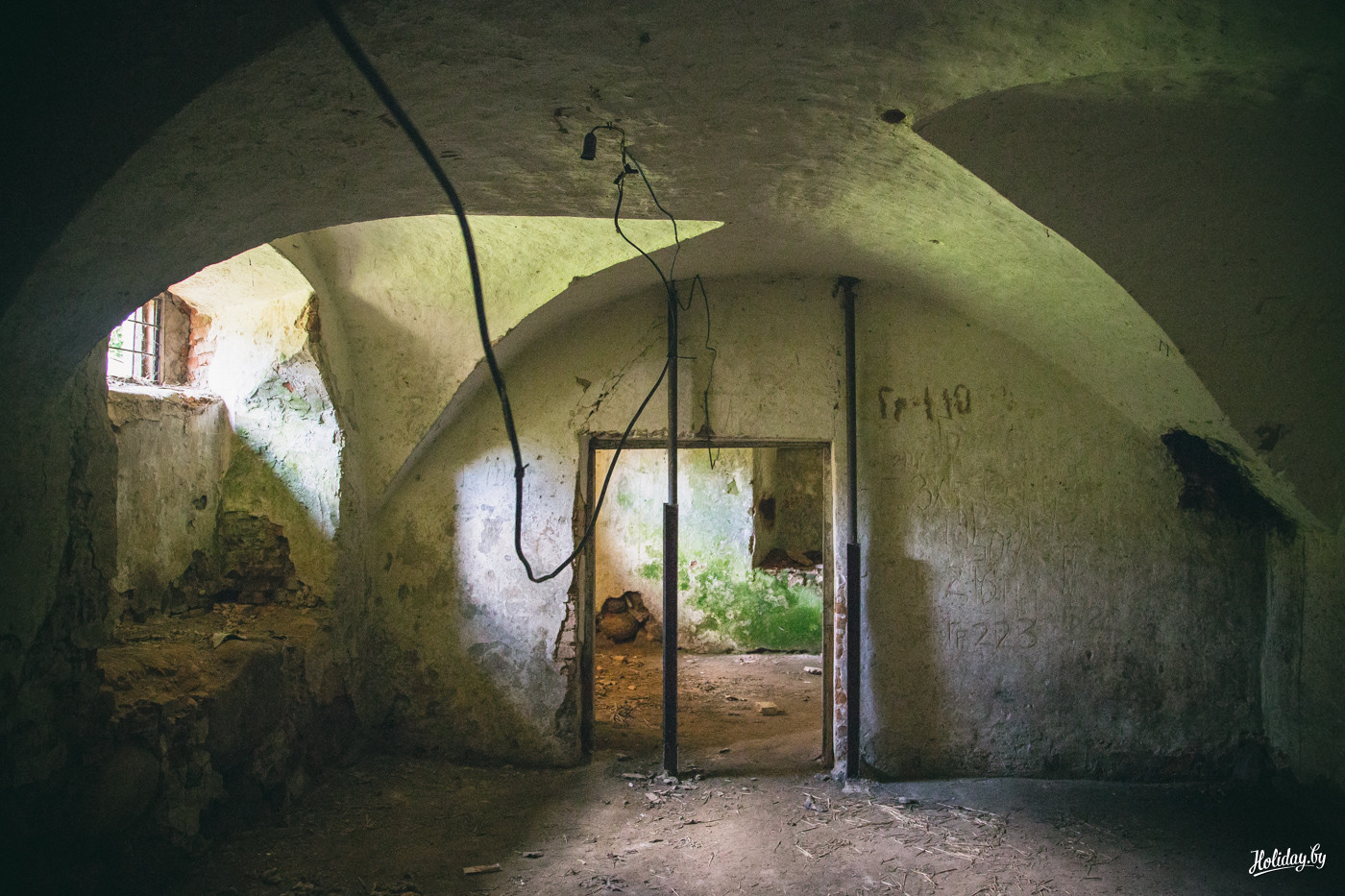 Надо понимать, что гробница давно разграблена и разрушается. Внутри в помещениях для гробов лежит кладбищенский мусор, а сквозь кирпич и штукатурку проросли деревья. По всем канонам в пирамиде есть «секретная комната» на втором ярусе, куда забраться можно только по стене строения. Будить духов Завишей мы не стали – поэтому осмотрели памятник только с земли. К слову, наряду с современными захоронениями, рядом с пирамидой находится могила представителя ещё одного известного рода – Наркевичей-Йодко.