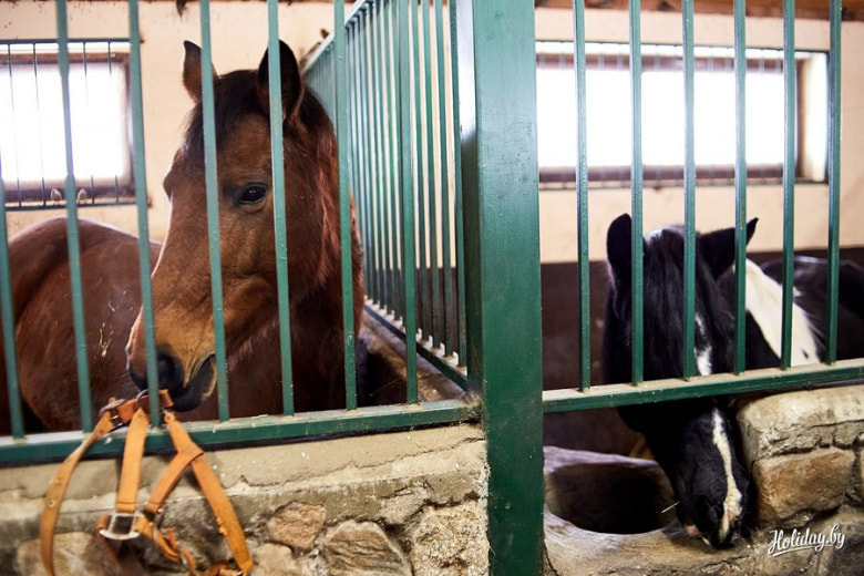 Животных в усадьбе нет, но рядом с домиком находится коневодческое хозяйство Якова Серафимовича, где можно покататься на лошадях.