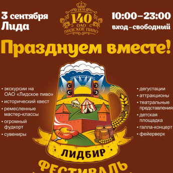 Организаторы обещают чрезвычайно насыщенную и разнообразную программу на любой вкус. Посетителям расскажут об истории белорусского броварства, будут организованы исторические квесты, ремесленные мастер-классы, театральные представления, дегустации, экскурсии на ОАО "Лидское пиво". Можно будет покататься на аттракционах, приобрести сувениры и многое-многое другое. И, конечно же, музыки много не бывает! Здесь будут открыты две музыкальные сцены. Ближе к концу фестивального дня всех гостей ждет большой концерт на основной сцене с участием рок-групп Neuro Dubel и «БИ-2», а также молдавского коллектива Zdob Si Zdub. Мероприятие пройдет 3 сентября — в этот же день лидчане отпразднуют и День города. Вход на фестиваль свободный. Трансфер с компанией «Колесо путешествий» – это комфортабельный автобус и профессиональный экскурсовод, которые интересно и с комфортом доставят Вас к началу основного веселья, расскажут историю города Лиды и её замка и, конечно, вернут обратно после завершения программы! Пройдите по ссылке, чтобы узнать подробности: