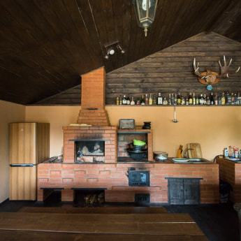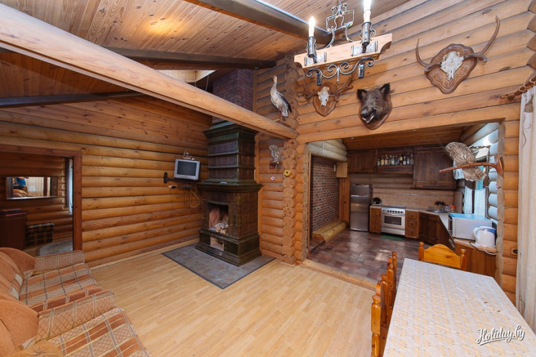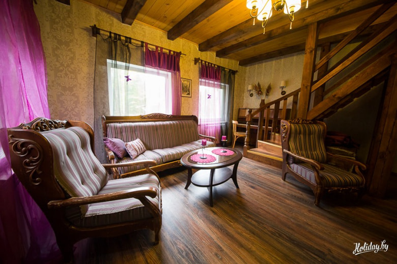 В усадьбе под Минском есть просторный двухэтажный деревянный дом и маленький гостевой коттедж. В первом смогут разместиться до 15 человек, во втором — до 10. К слову, гостям с детьми хозяева предоставляют скидки. Из развлечений предлагается рыбалка на озере Раубичи , купание в закрытом бассейне, посиделки у камина и многое другое.