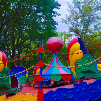 Людей в парке даже в будний день все еще немало. Дети с интересом рассматривают карусели и умоляют родителей прокатиться: «Ну, еще хотя бы на одной». Взрослые гуляют с собаками (несмотря на официальный запрет - на входах в парк есть соответствующие таблички) или просто сидят на скамейках, наслаждаясь вечером.
