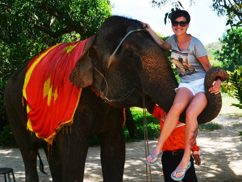 Я решилась попробовать залезть на хобот слона. Стоит такое удовольствие 50.000 донгов, что чуть больше 2 долларов. Мной двигал интерес, как такое большое животное может быть таким аккуратным и добрым. Кажется, гладила бы его и гладила. Он абсолютно аккуратно обхватывает тебя хоботом, если неудобно может слегка подбросить и обхватить сильнее. Можно не бояться, он не уронит, потому что очень осторожен. Не смотря на свою масштабность, он очень нежный и добрый. Мне с даже жалко стало его, когда я представила, сколько людей за день он поднимает своим хоботом.