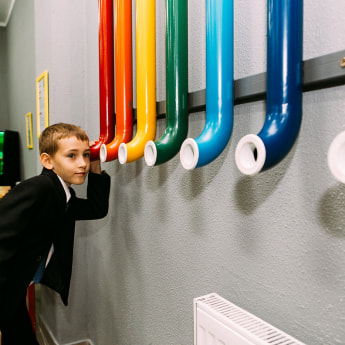 Идем дальше: акустическая комната. Здесь, как нам показалось, размещен самый нужный каждому трудоустроенному человеку экспонат – децибелометр, способный измерить уровень шума. Чтобы проверить, насколько громко мы можете кричать, нужно просто засунуть голову в деревянный ящик и сочно заорать: чем громче голос, тем больше лампочек загорится на децибелометре. Мы смогли осилить только восемь.