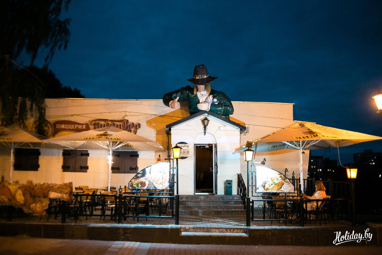 Не унывая, спускаемся к мемориалу «Три штыка». Людей - нет. И вдруг, на наше счастье, из-за угла появляются двое веселых мужчин с пакетами из «Евроопта»:«Так сегодня же пятница! В ресторан надо идти. Вот в «Собрание», например. Как там? Не знаю, ни разу там не был. О чем вы, моя жена 300 рублей всего получает.