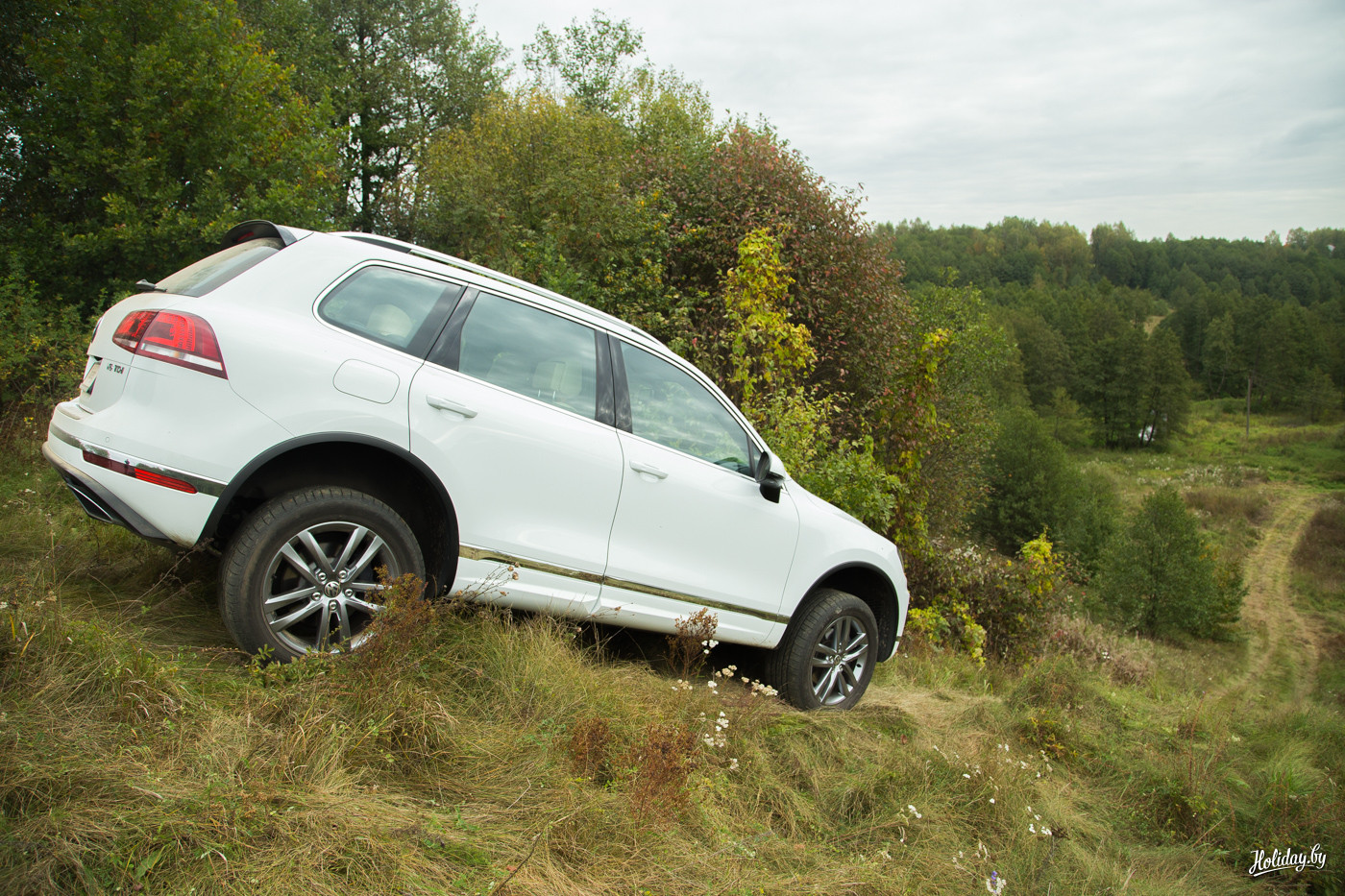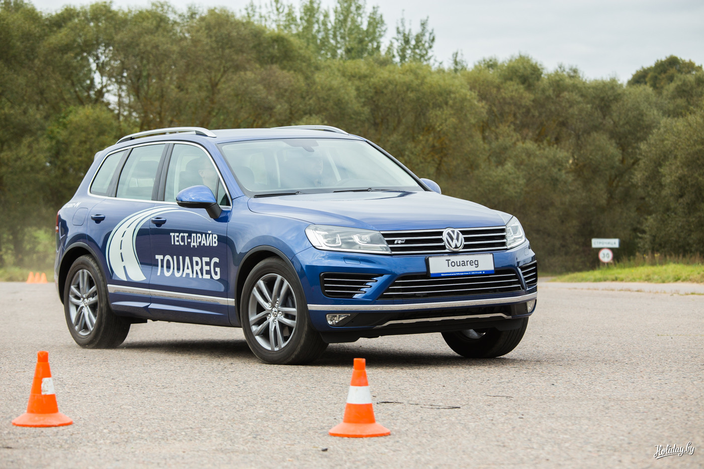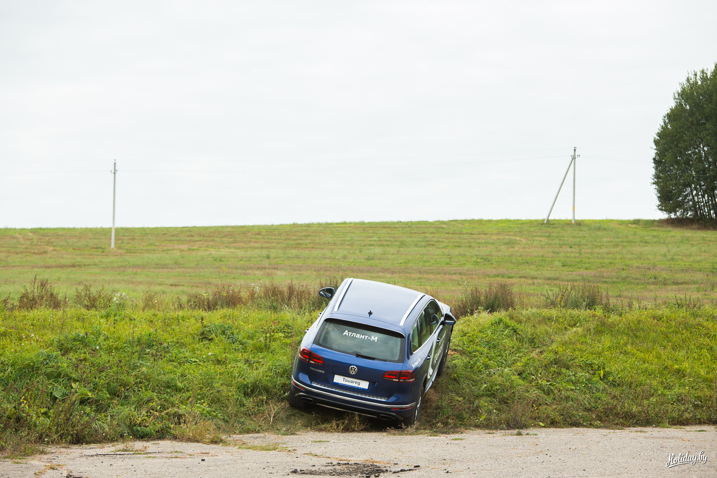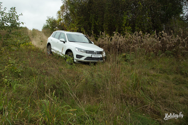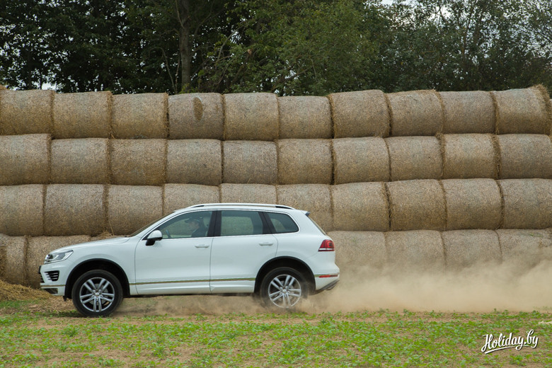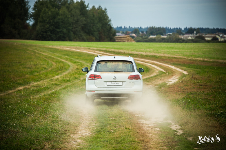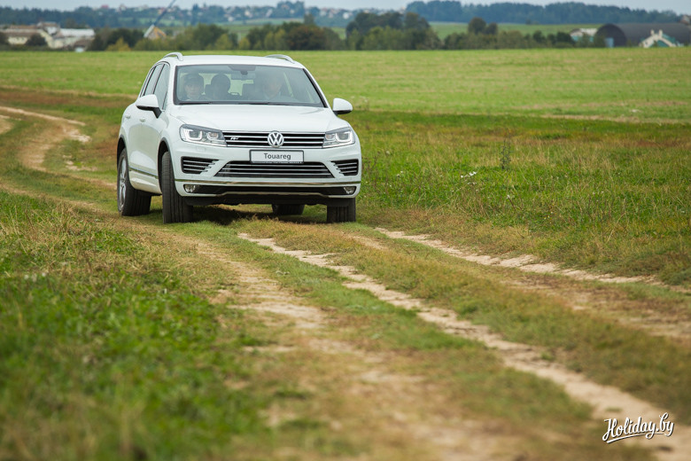 Последняя модель Volkswagen Touareg имеет постоянный полный привод 4MOTION с ассиметричным распределением крутящего момента. При этом производитель заявляет про феноменальный угол возможного наклона безопасного передвижения – 35 градусов. Чтобы испытать его, было решено выполнить скоростное маневрирование на площадке, а затем проделать любимое всеми белорусами упражнение – «езжай на вот это поле за бульбой вот через тот бугор».