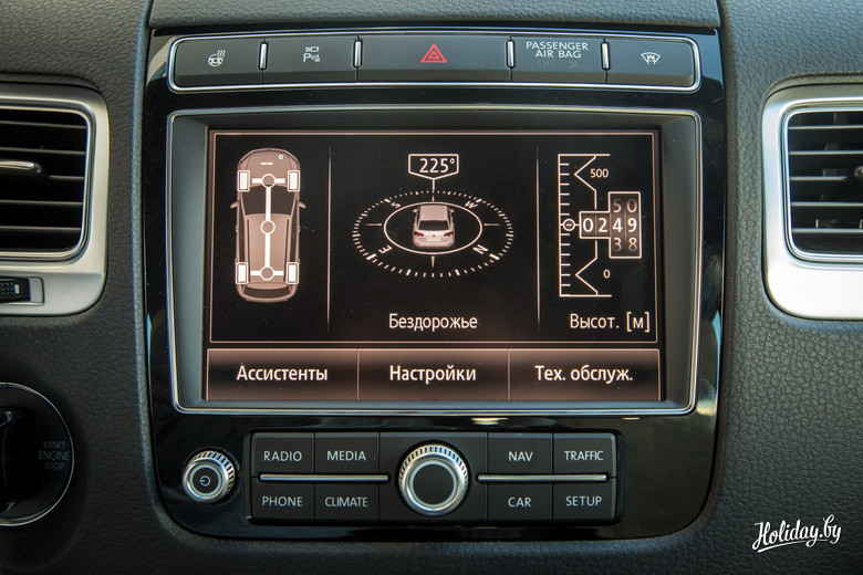 Квадратиш. Практиш. Валишь, как говорится. Порой есть необходимость и в таких маневрах есть, сами понимаете. Пневмоподвеска, которая установлена на наших R-Line «Туарегах», поднимает кузов до приличных 300 мм над грунтовкой и рытвинами.