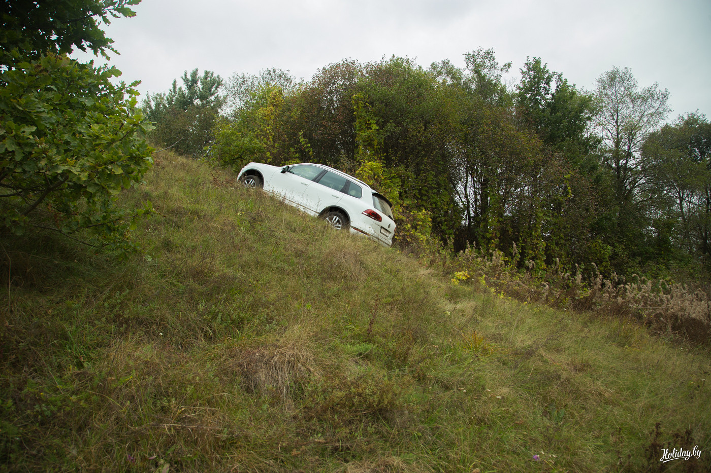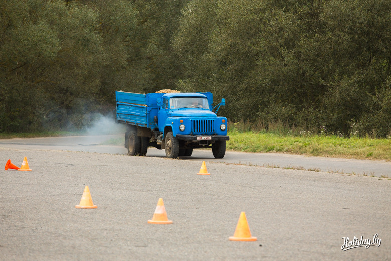 Когда на тот же процесс смотришь со стороны, то даже не верится, что на обычных шинах тяжелая машина способна преодолеть очень серьезный наклон по колее, в которой половина покрытия – это скользкая трава. Сами посмотрите на фото – деревья, это единственное прямостоящее в кадре. И тут победа!