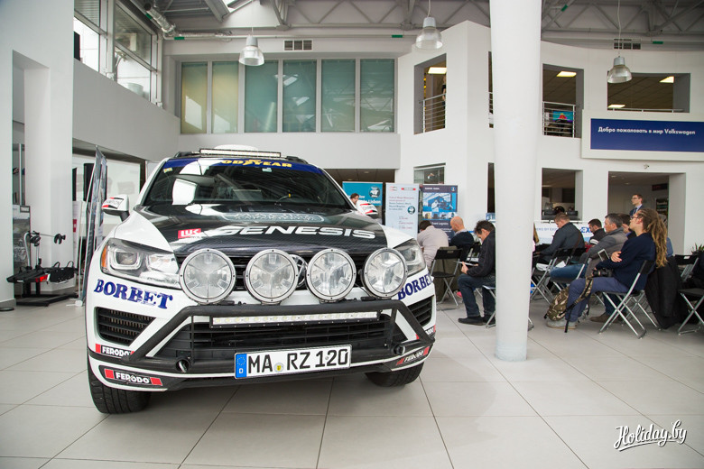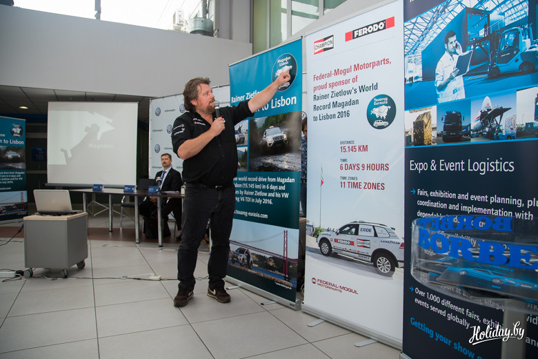 Дело в том, что для презентации VW Touareg российской сборки журналистам автодилер «Атлант-М Уручье» пригласили путешественника Райнера Цитлоу. Я писал о нём летом, когда он проезжал Минск во время подготовки маршрута для очередного рекорда Гиннеса. Суть в том, что Райнер уже который год не просто путешествует на «дальняки», а просто колесит наш земной шарик на такой скорости, что авторы известной книги рекордов только успевают записывать за ушлым немцем.