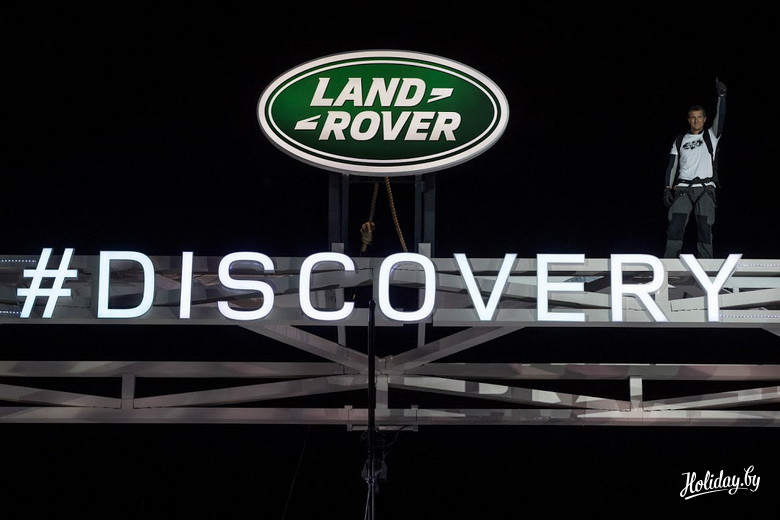 Яркой частью презентации стало эффектное появление британского путешественника Беара Гриллса, спустившегося на веревке с самого верха огромной инсталляции прямо к новому Discovery.