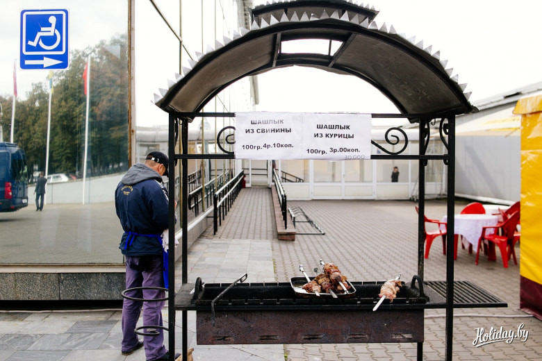 По традиции туристская выставка проходит в НВЦ «БелЭкспо». Рядом со входом в который как и всегда на подобных событиях стоят две палатки с едой. А еще мангал, на котором жарят шашлык из свинины и курицы.