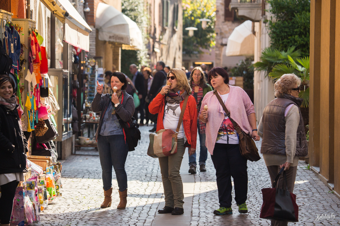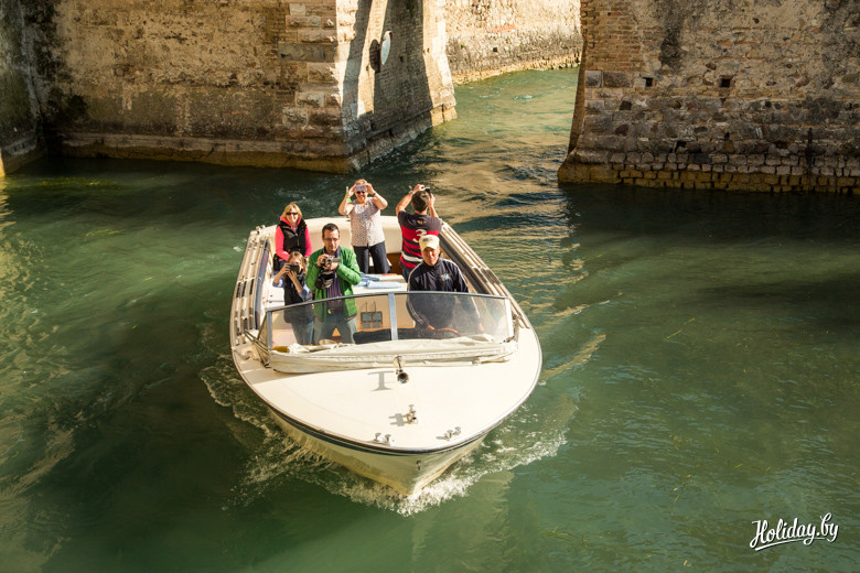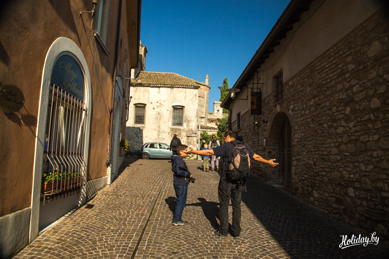 В старый город попадаешь через «Рокка Скалигера» - квадратный в плане замок, который защищал единственный пешеходный мост, по которому сегодня в обе стороны двигаются толпы туристов. Вход в сам замок платный, и заплатить стоит хотя бы за то, чтобы подняться по 146 ступеням на башню и сделать несколько кадров крыш Сирмионе на фоне огромного блюда озера.