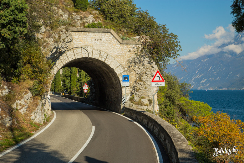После того, как вы сделаете лучшие кадры юга озера, вам потребуются лучшие качества вождения. Впереди большое количество тоннелей, вырубленных прямо в отвесных скалах. Их также относят к местным достопримечательностям. При этом постарайтесь не глазеть по сторонам, въезжая в открытые галереи – это может быть небезопасно в силу огромного потока машин в обе стороны (ведь это единственная дорога вдоль озера!). Если фотограф побеждает водителя у вас в душе, лучше аккуратно на «аварийке» приостановиться на одной из открытых площадок и удовлетворить желание сделать очередное селфи на фоне виндсерферов или живописно зависших на горах облаков.