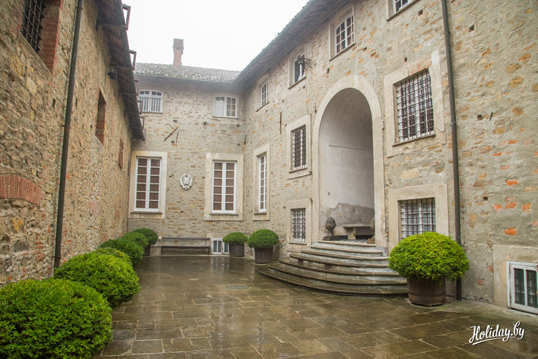 Сегодня это может показаться странным, но ещё недавно окрестности озера Комо и почти весь север Италии был известен благодаря производству шелка. В какое-то время лидером стал Китай, но до сих пор этот регион считается родоначальником лёгкой шелковой промышленности. В замках всегда был свой цех. В этом он переоборудован под большой зал, способный принять целый корпоратив. Сегодня тут кристально белые скатерти и гербы на картушах, а ещё вчера тут трудились десятки простых рабочих.