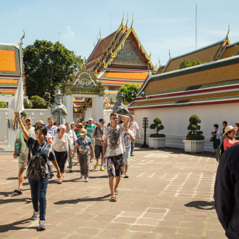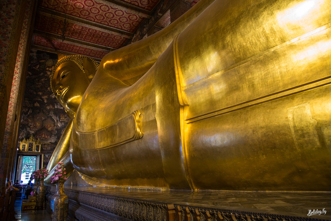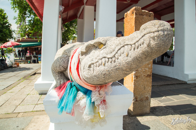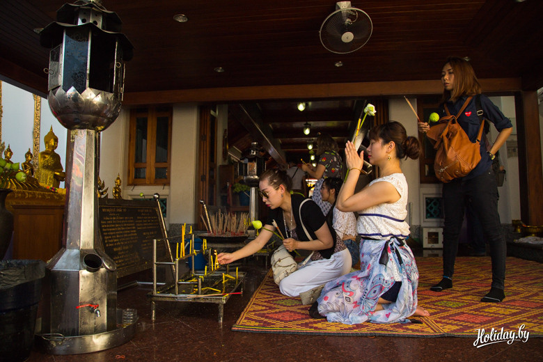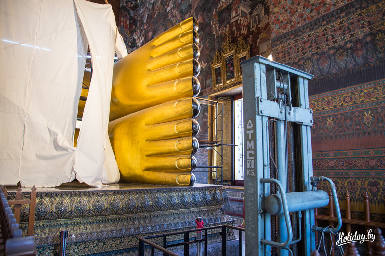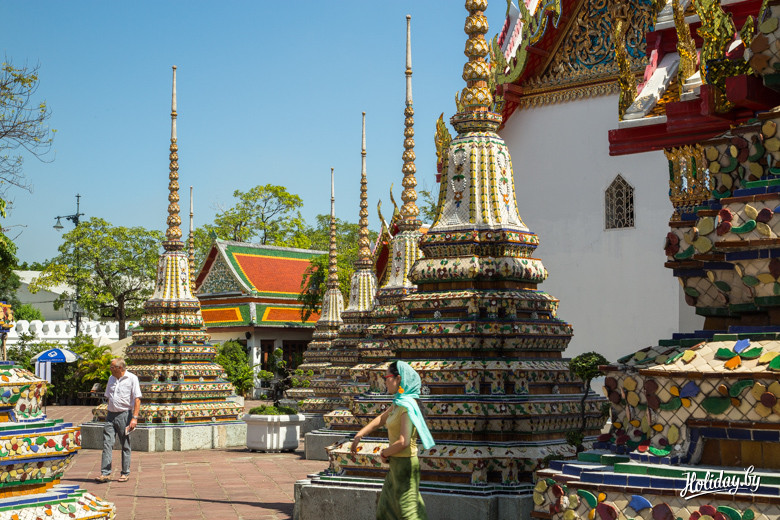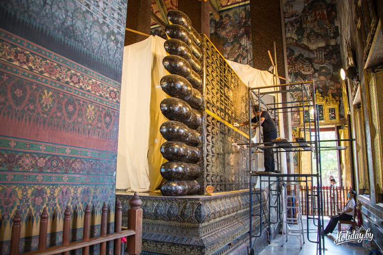 В цене билета включена бутылка воды, которая очень своевременна, если вы приехали сюда как мы в полдень. Место намолено – первый храм тут появился в XII веке. Считается, что это один из самых древних храмов столицы страны. Основной магнит – 46-метровая статуя лежащего Будды, над которым возвели сам храм. Вокруг находится 95 ступ – похожих на колокольчики сооружений.