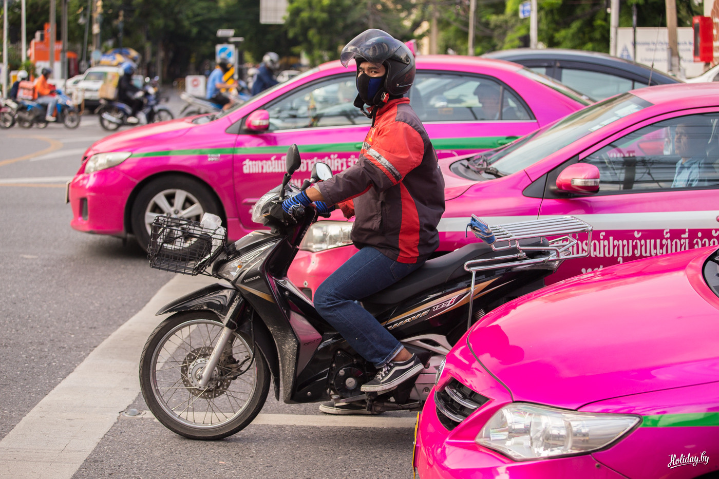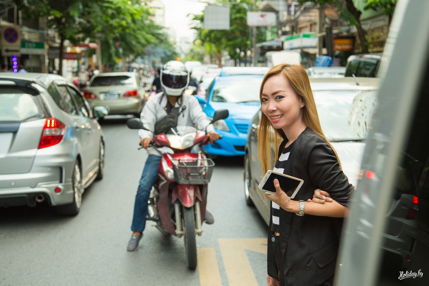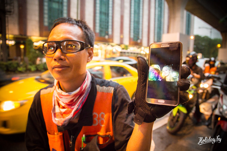 В городе огромное количество такси. При этом можно с комфортом и кондиционером постоять в пробке, а можно нанять мото-такси. Ребята в оранжевых жилетках с бейджами дежурят на каждом углу. Главное, чтобы он вас понял, куда везти. Один такой такси-байкер очень был рад знакомству и долго показывал фоточки любимых клиентов на экране телефона.