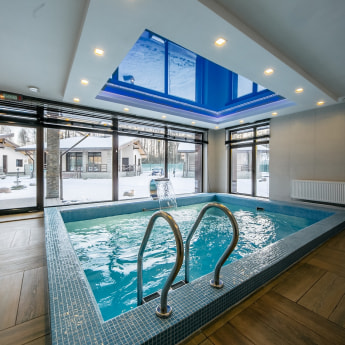 Главная забава в комплексе – аквазона, в которую входят два бассейна, баня и сауна. Располагаются они в соседних домах. И в бане, и в сауне бассейны – не просто заполненное водой углубление, а настоящий тренажер.