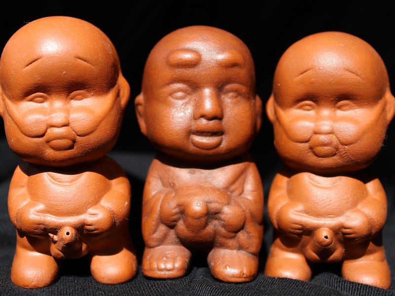 Также чайные наборы включают в себя занимательные атрибуты наподобие статуэток Будды и писающих мальчиков. Миниатюрные фигурки способны менять цвет при поливании их кипятком или исторгать струи воды.