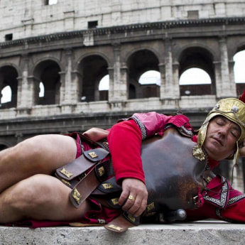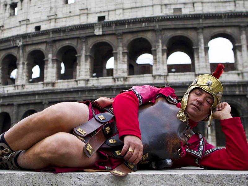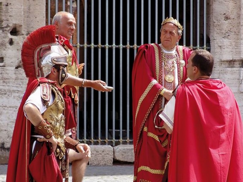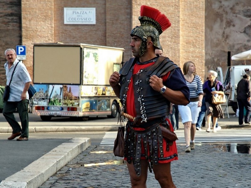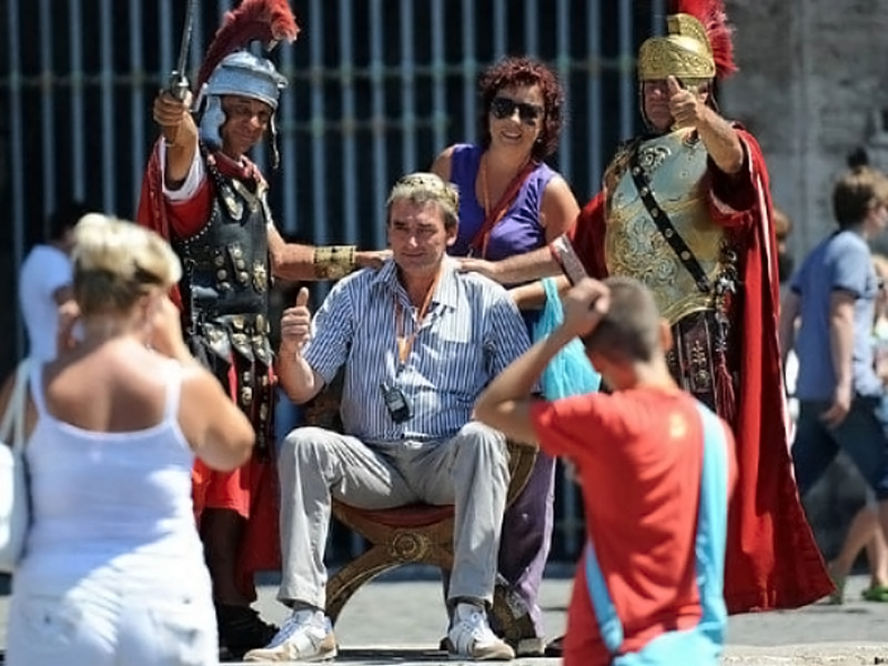 На протяжении многих лет десятки римлян в шлемах, сандалиях и кирасах трудились у достопримечательностей, заманивая туристов. Что характерно, при фотографировании итальянцы то и дело приставляли меч к горлу или животу иностранных гостей, а если им попадалась женщина — приглашали ее разместиться на коленях и надевали ей на голову шлем.