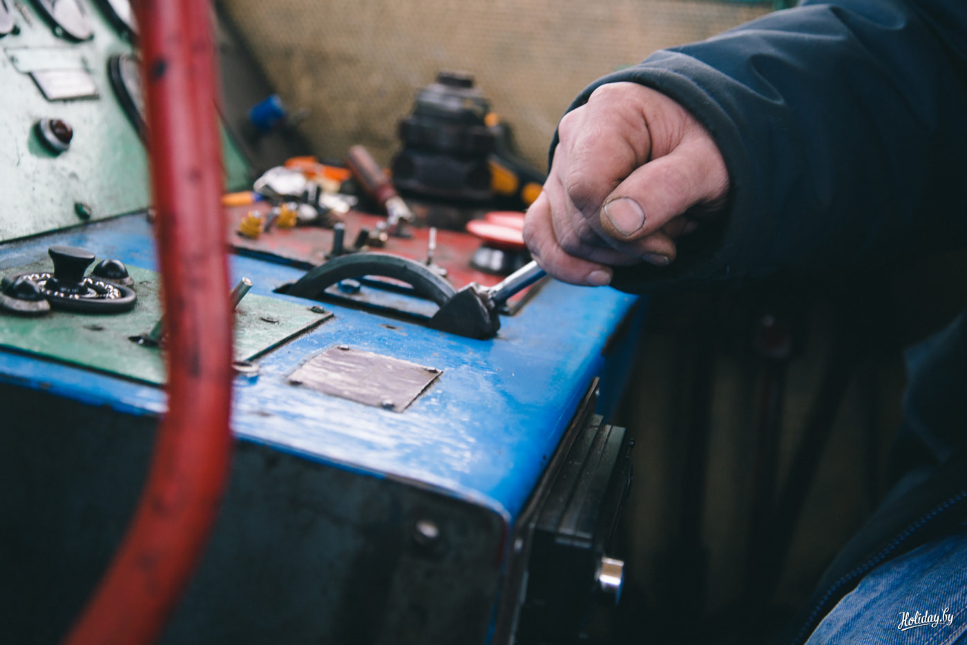 На панели управления лежит большой фонарь и гаечный ключ с надписью «made in USSR», под панелью закреплен магнитофон: «Сломался, зараза», - комментирует машинист.