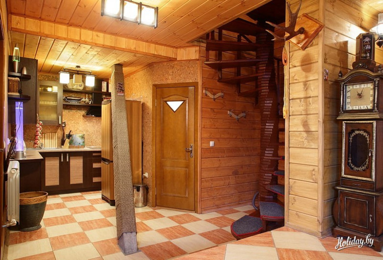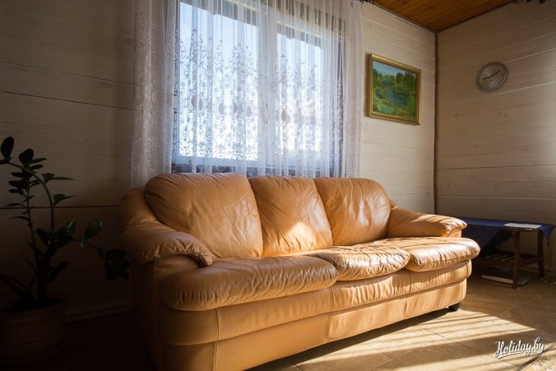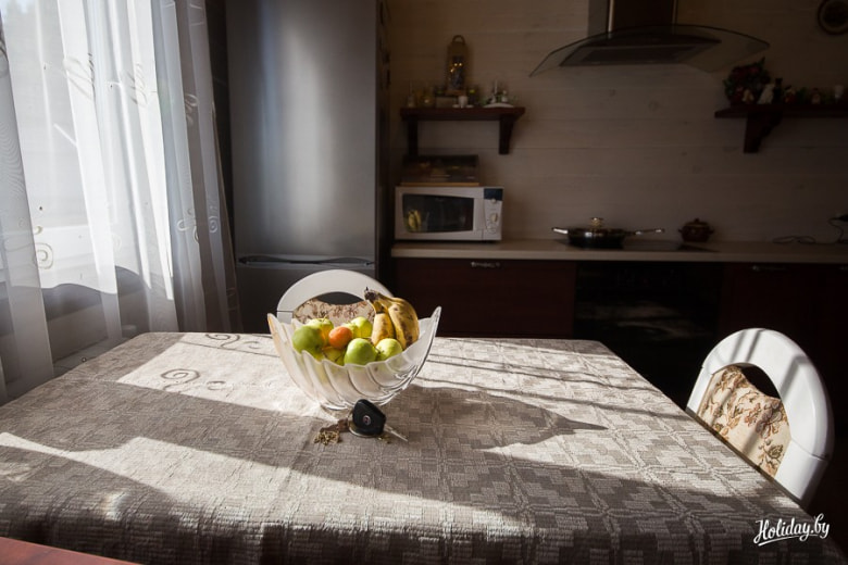 Фишка места – близость к столице, всего 3 км от МКАД. Коттедж стоит на берегу реки Свислочь, в окружении леса. Так что, просыпаясь, гости не слышат шума машин и соседской дрели. В аренду сдается второй этаж, он отлично подойдет для семейного отдыха и небольших дружеских компаний: всего в коттедже смогут отдыхать до 12 человек, до 8 с ночевкой. Есть кухня и вся необходимая для приготовления еды техника.