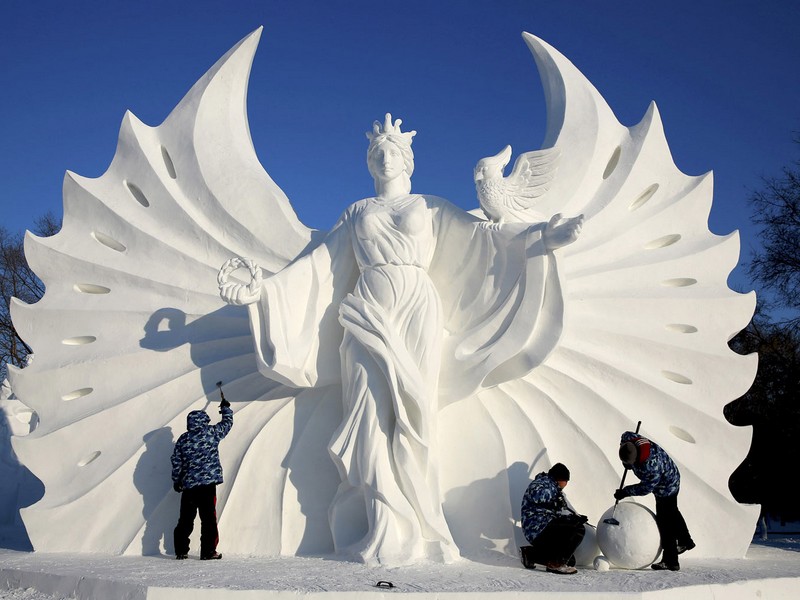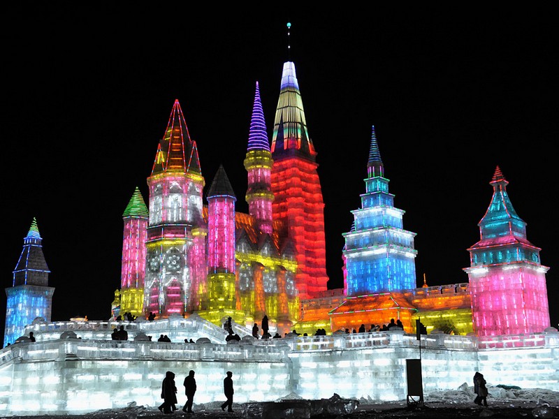 Получивший прописку в Харбине, столице провинции Хэйлунцзян, Международный фестиваль ледяных и снежных скульптур — самый масштабный в своем роде на всей планете. Для такого мероприятия здесь весьма подходящий климат: на холодных зимах сказываются сибирские ветры. Ледяной город занимает более 800 000 квадратных метров, а над его созданием трудятся около 10 000 мастеров. На строительство животных, мультипликационных персонажей и достопримечательностей в миниатюре тратится около 150 000 кубометров льда.
