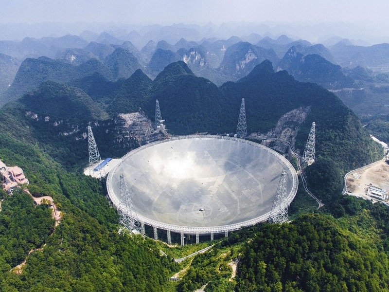 Расположенный в заливе Даудан в провинции Гуйчжоу, пятисотметровый радиотелескоп — бесспорный мировой рекордсмен по размерам. Разработка и создание аппарата потребовало пять лет труда и 160 миллионов евро. На «тарелке» прибора может уместиться 30 футбольных полей. Цель радиотелескопа — в поиске сигналов звезд и галактик, в том числе, внеземных цивилизаций.