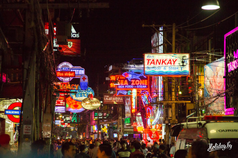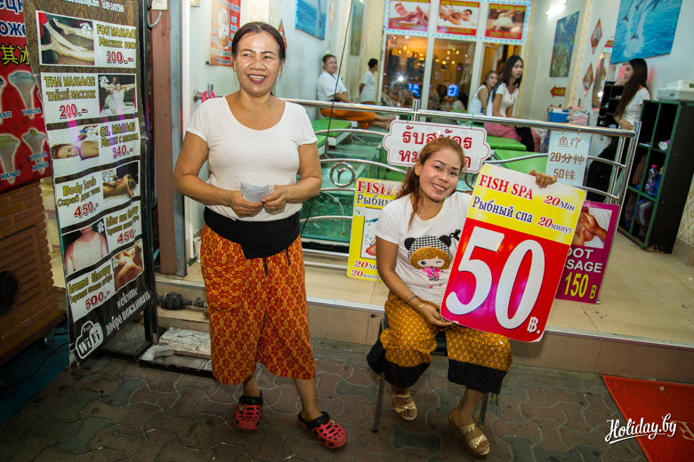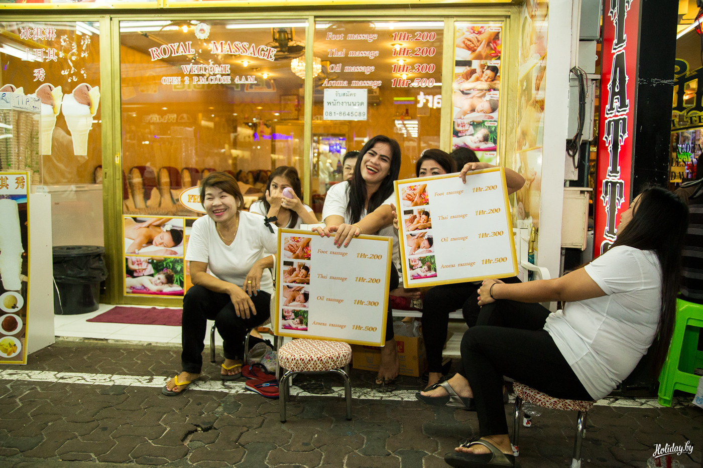 Поэтому многие туристы в Паттайе отправляются прямиком на прогулочную улицу Walking Street. Гулять полночи по ядрёному миксу из рынка в стиле «Динамо», квартала красных фонарей в Амстердаме, баров, уличных забегаловок и прочего увеселения – очень необычно и колоритно, но в какой-то момент становится утомительно физически. Взгляд всё больше останавливается не на стройных девушках-зазывалах, а упитанных женщинах с табличками «Массаж ног» или «Рыбное СПА». Повсюду тебя тянут помассировать различные части тела.