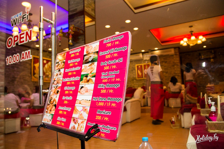 Возле входа на Walking street мы таки отдались в руки уличных массажисток, заказав «всё включено» для ног. Сама процедура длится около часа и на удивление приятна. Нет, не так. Я сумел на добрых полчаса отключиться и поспать, хотя не планировал. Плюс к этому об эффекте свидетельствовала супер-довольная физиономия товарища. Ну, разве может быть таким довольным белорус сам по себе? Вот и я думаю, что всё дело в волшебных руках массажисток – умеют они нажать на нужные точки. Надо сказать, что массаж ног – это самая доступная услуга в таких салонах. Час удовольствия обойдется в примерно 10 BYN (около 5 USD).