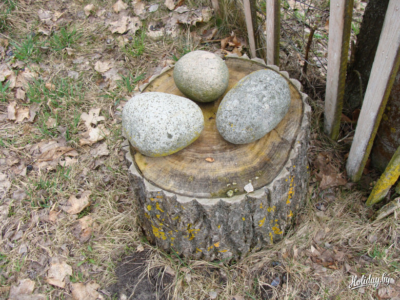 Рядом с забором мы заметили любопытную композицию из трех каменных овалов на пеньке. «Наверное, из таких драконы и вылупляются». И нет, эта мысль не была навеяна новым трейлером «Игры престолов».