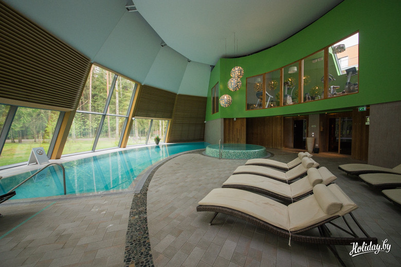 Изогнутый бассейн с минеральной водой, находящийся в необычной «шишке» рядом с отелем, вмещает желающих поплавать или полежать у воды. Здесь расположено несколько рядов лежаков с видом на лес, а также имеются несколько саун. Для желающих в отдельном боксе вам предложат сделать вертикальные ванны – очень полезные процедуры для вытяжки позвоночника. Говорят, что сюда за ними приезжают даже из Друскининкай, где работает свой центр SPA Vilnius.