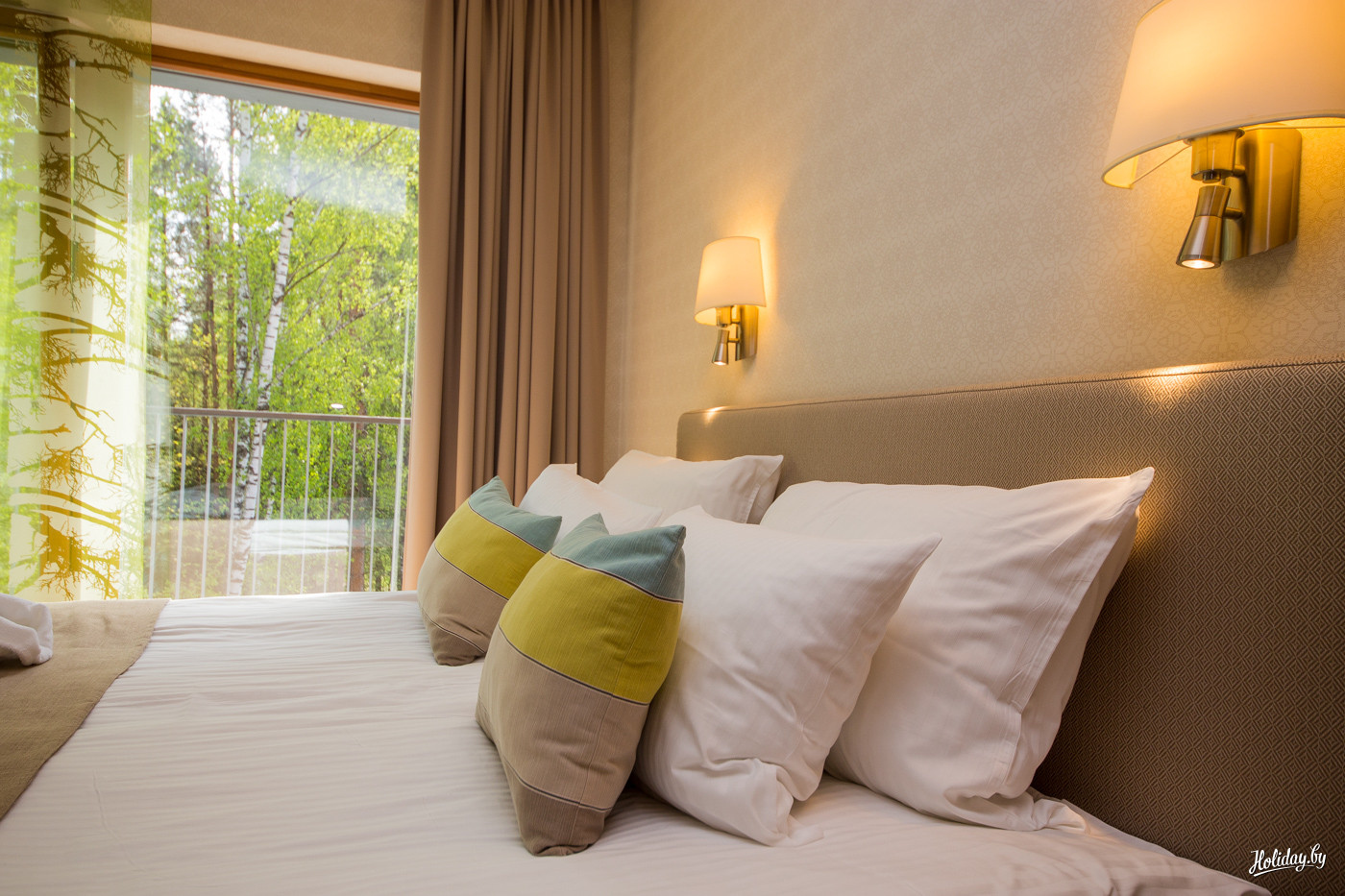 Пройдемся по номерам. Оформление очень спокойное. Даже лифт ездит так медленно, намекая, что ты в SPA, а не в бизнес-центре. Дизайн комнат я бы назвал литовским – он основан на ныне модном скандинавском хюгге-стиле, но прослеживается локальная нотка и колорит. К слову, литовцы знают толк в дизайне интерьеров в принципе! Во всех номерах очень сильно ощущается местность – дело в том, что почти во все окна смотрят высокие деревья бора. Проходя через стволы деревьев дневной солнечный свет добавляет своих узоров на полу и стенах номеров SPA Vilnius Аникщяй. Так достигается уникальность оформления каждого номера, хотя формально они выполнены в одной гамме и стиле.