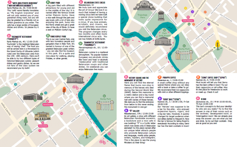 Сначала девушки сделали 5-дневные туры в Минск: сюда входит экскурсия по городу, поездка на дачу (в «Забродье»), городской квест. Но при этом они уже давно мечтали сделать свой веселый, иллюстративный, англоязычный путеводитель.