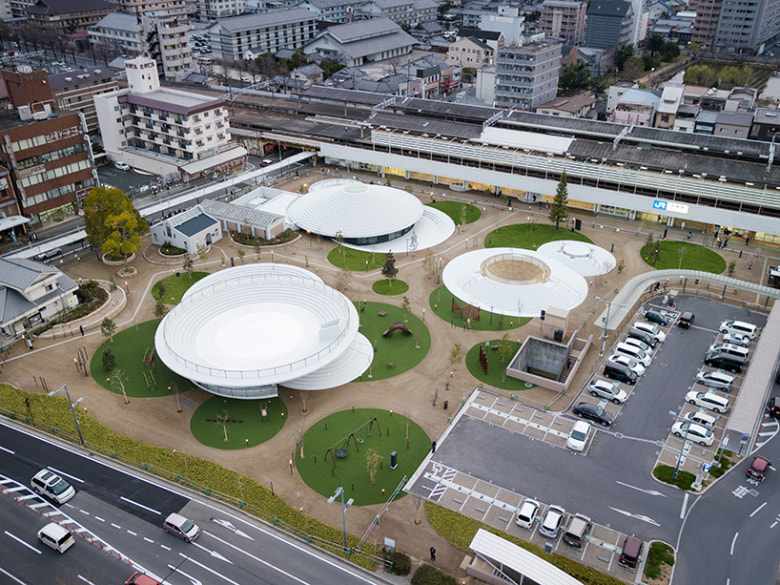 Поскольку в городе Тэнри находится множество древних японских гробниц, известных как «кофун», команда дизайнеров переосмыслила форму этих мегалитических насыпей на площади. Архитектура, вдохновленная кофуном, была сконфигурирована в самых разных целях. Структуры одновременно служат лестницами, скамейками и крышами.