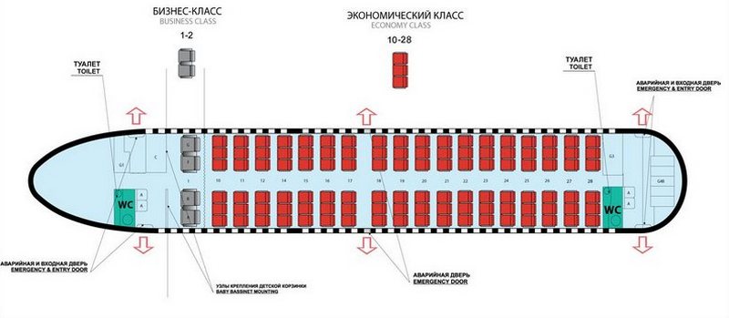 Комфортное размещение — залог приятного полета. И потому стоит заглянуть в салон нашей модели. Как видно на схеме Боинга 737-300, там — 29 рядов сидений. Из которых, впрочем, не все подходят для длительного полета: 29-й ряд, упирающийся спинками в санузел, 28-й, также близкий к туалетам, а потому — беспокойны, 16-й с неоткидывающимися креслами из-за аварийных люков за спиной и, наконец, 10-й, соседствующий с перегородкой.