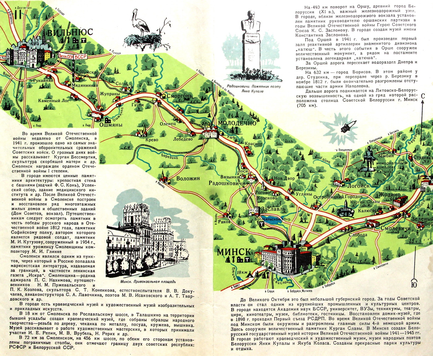 Постепенно в СССР увеличивалось количество гостиниц, рос качественный уровень туристических услуг. Автотуристам уже не нужно было брать с собой палатки для ночлега, им даже не нужно было предварительно продумывать маршрут путешествия – государство позаботилось и об этом. Главное управление геодезии и картографии при Совете министров СССР в 1960-е и 1970-е разработало сотни автомобильных маршрутов по самым разным уголкам Советского Союза. За неимением возможности выехать за рубеж советские автотуристы колесили по союзным республикам, посещая памятные места и официальные достопримечательности. Часто в такие министерские маршруты включались и объекты из Беларуси: Курган Славы, город-герой Минск, Бресткая крепость – вот лишь малый список обязяательных для посещения советскими туристами мест.