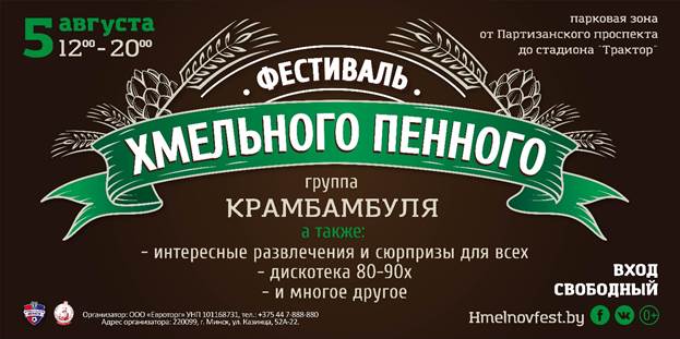 Классная музыка, расслабляющая атмосфера, забавные конкурсы! А еще весело, вкусно, сытно, музыкально! Только 5 августа в Минске долгожданное выступление группы «Крамбамбуля» после долгого затишья. На фестивале «Хмельного пенного» все просто: пришел, увидел, сплясал. Лучшие хиты группы, такие, как «Госьці», «Турысты» и многие другие до боли знакомые песни. Вы сможете потанцевать под мировые хиты 80-х и 90-х, и все это на фестивале «Хмельного Пенного» в исполнении лучших кавер-бендов.